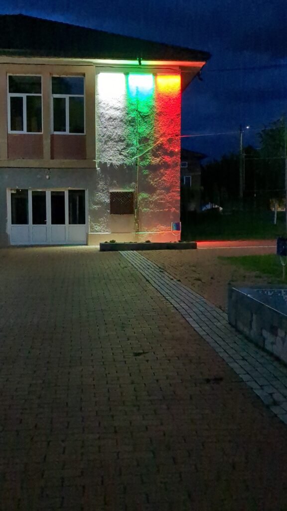 Със средства, осигурени от дарения, поставихме осветление на фасадата на читалищната сграда в цветовете на българското знаме.